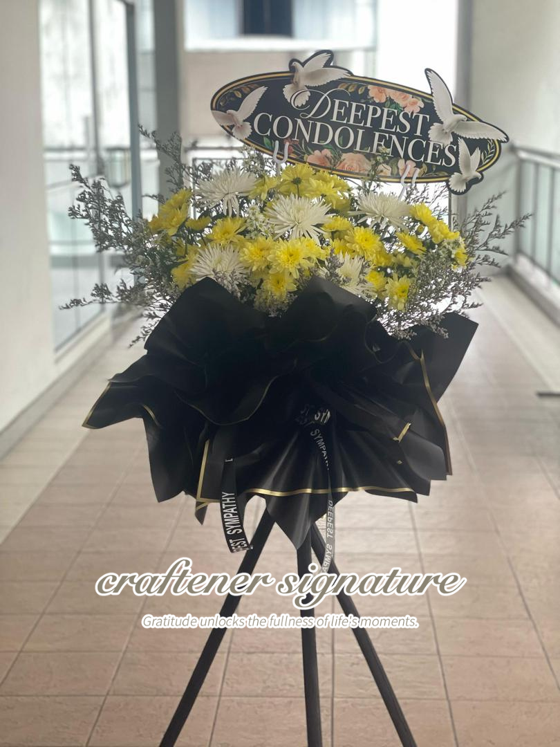A serene arrangement of white and yellow chrysanthemums, symbolizing purity and remembrance. The elegant black-gold wrapping enhances its solemnity, offering heartfelt sympathy and respect to honor a life well remembered.
