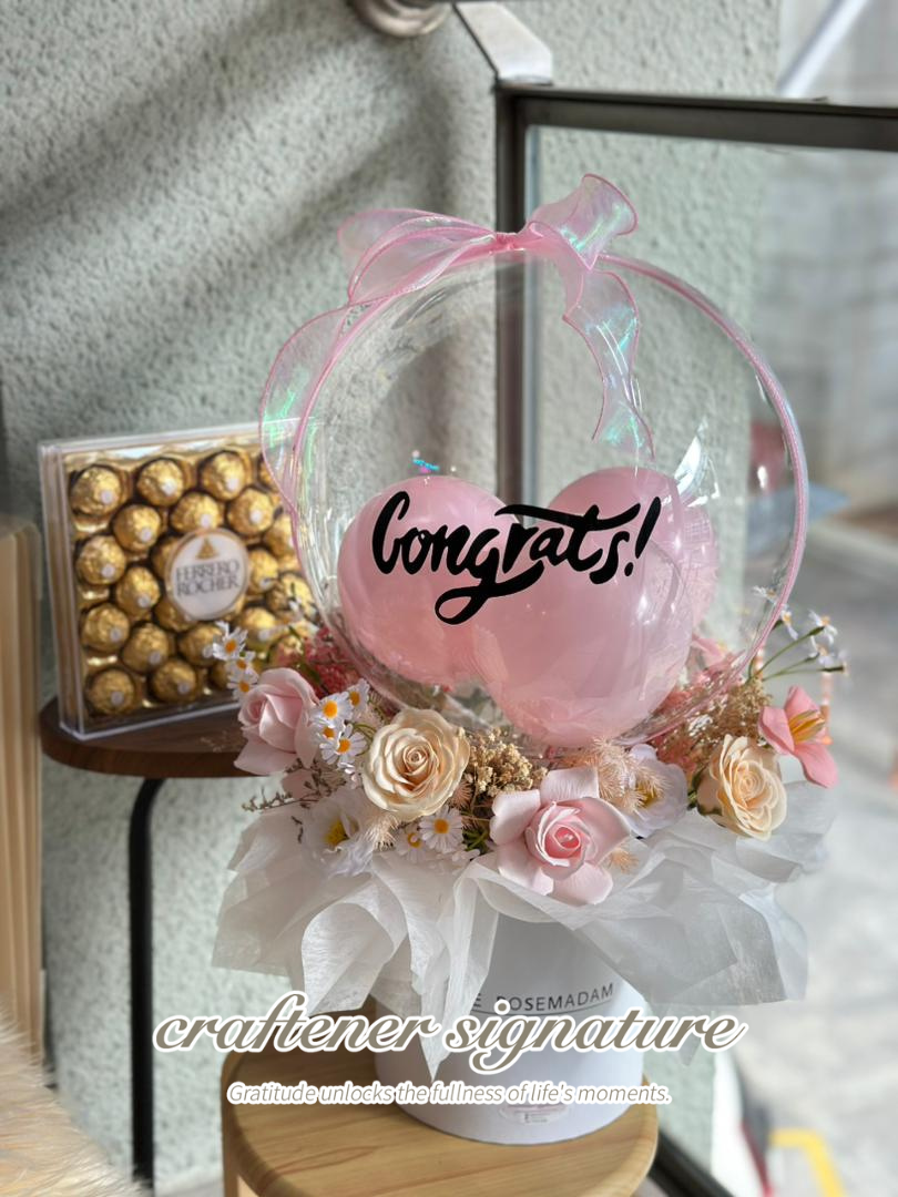 A joyful blend of pastel florals and a transparent balloon centerpiece — radiating happiness and elegance. Perfect for celebrating milestones and sharing heartfelt congratulations.