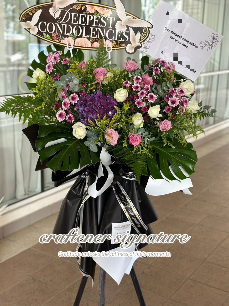 This funeral wreath features purple hydrangeas, pink roses, white roses, purple chrysanthemums, and green foliage, arranged tastefully. The black and white wrapping adds a solemn touch to the design. A sign at the top reads Deepest Condolences, offering comfort and respect for the loss.
