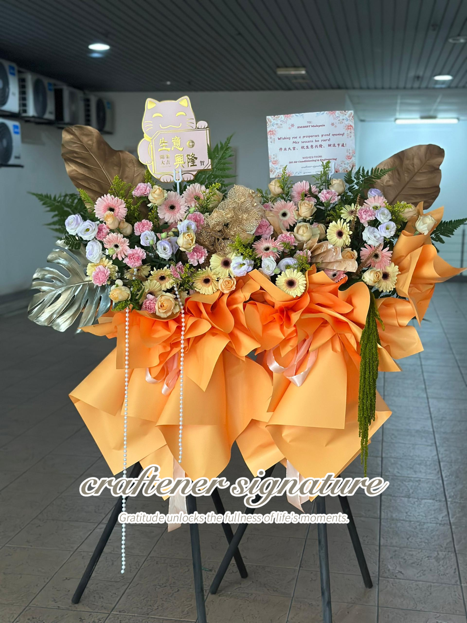 A grand opening flower stand by Craftener Signature, featuring a vibrant mix of orange and pink-purple blooms that symbolize success and energy.