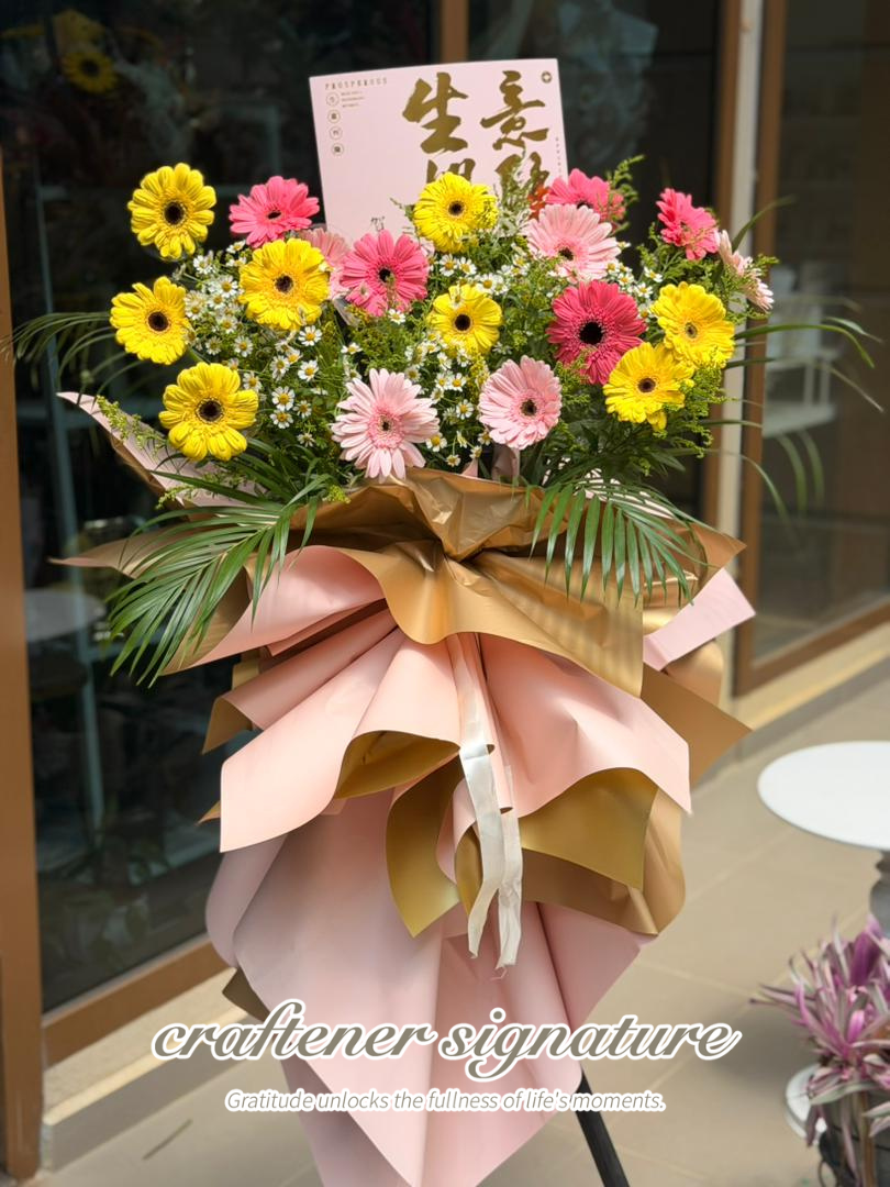A vibrant grand opening floral stand featuring fresh gerbera daisies in cheerful yellow and pink tones, complemented with delicate chamomile fillers and lush greenery. Wrapped in premium blush pink and champagne gold layers, creating a soft luxury and welcoming presentation. Comes with a customizable congratulatory message card.