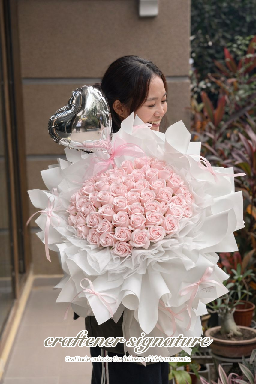 Heart-shaped soap roses arranged in a soft blush dome, paired with a silver heart balloon for a sweet and lasting surprise.