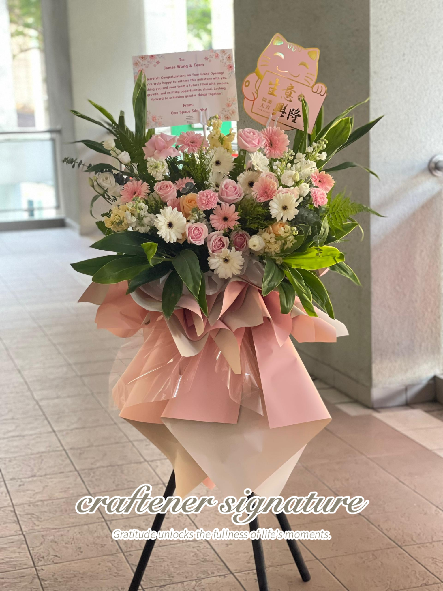 A soft and graceful congratulatory flower stand featuring a harmonious mix of pastel pink, white, and blush-toned blooms complemented by fresh greenery. Wrapped in elegant blush and white paper, this arrangement conveys warmth, sincerity, and refined beauty, perfect for heartfelt celebrations and professional milestones.