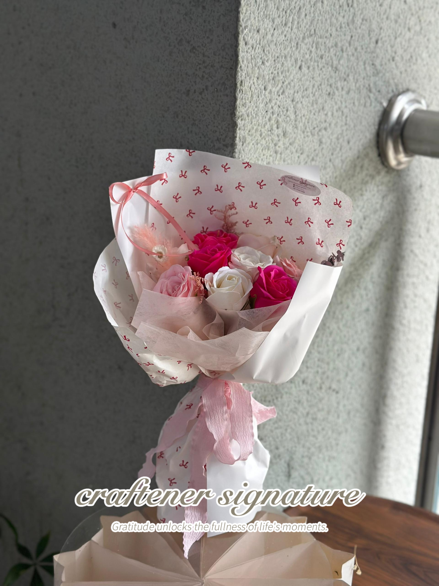 Pink, white, and magenta soap roses dance gracefully like Cupid’s steps, silently blooming within the pristine white paper adorned with butterfly patterns,
