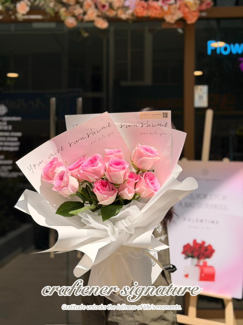 A charming bouquet featuring soft pink roses wrapped in layered white paper with a romantic printed floral sleeve. The design feels bright, sweet, and uplifting, making it a perfect bouquet to express warmth and affection.