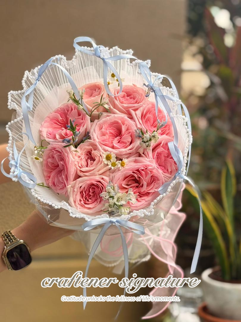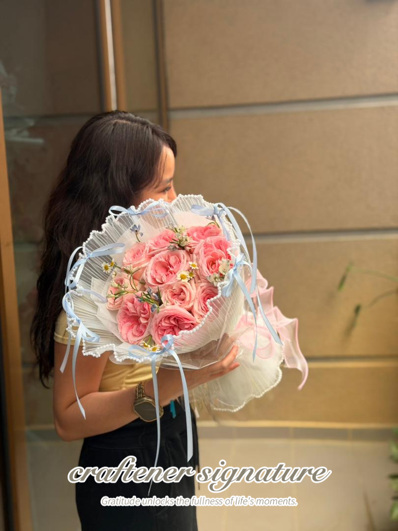 A romantic hand bouquet featuring soft blush pink roses, delicately wrapped with pleated white lace edging and finished with pastel blue ribbons. The overall design feels dreamy, gentle, and feminine — perfect for expressing affection and heartfelt emotions.