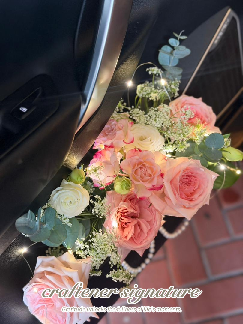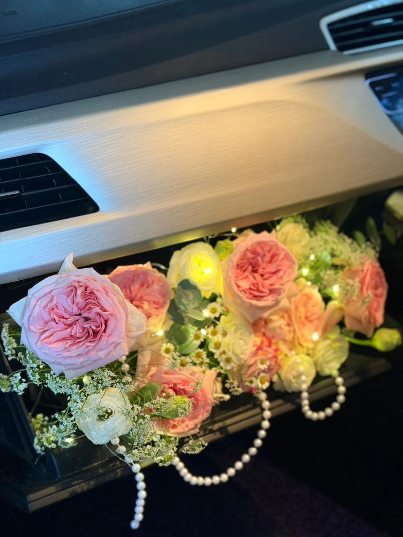 Transform the passenger seat into a romantic surprise with our handcrafted fresh flower car decor. Designed with soft-toned blooms, fairy lights, and elegant details, this setup creates an intimate, unforgettable moment the instant the door opens.
